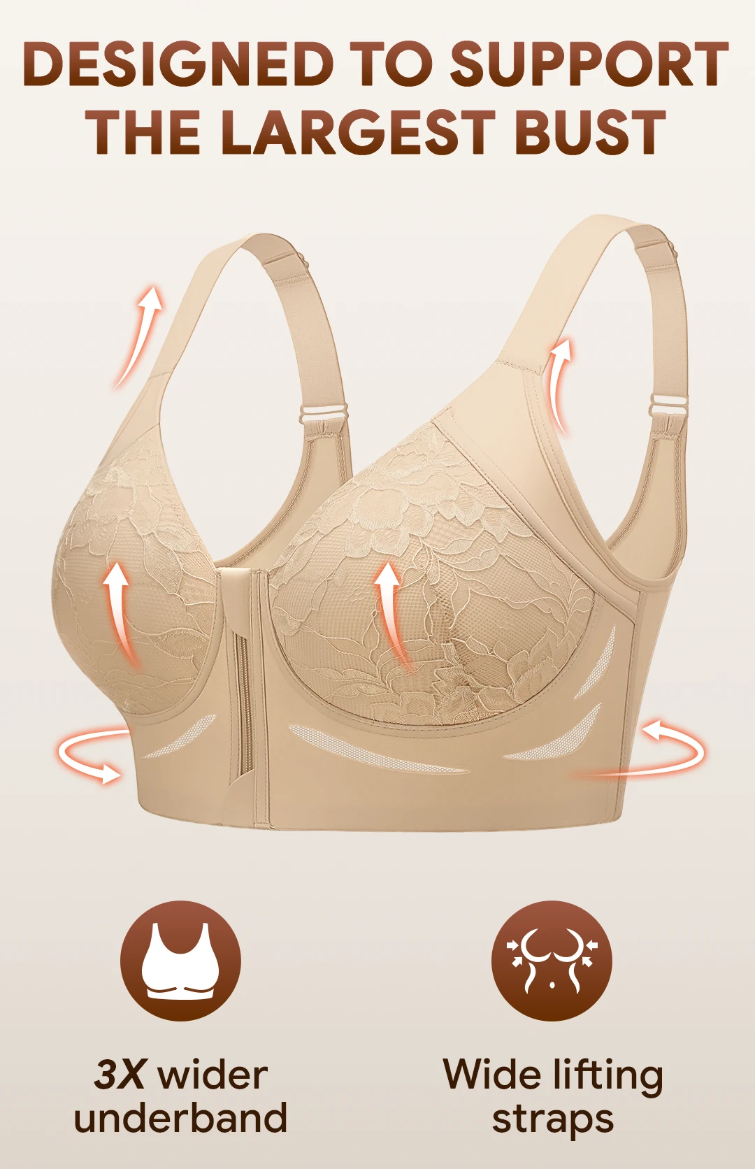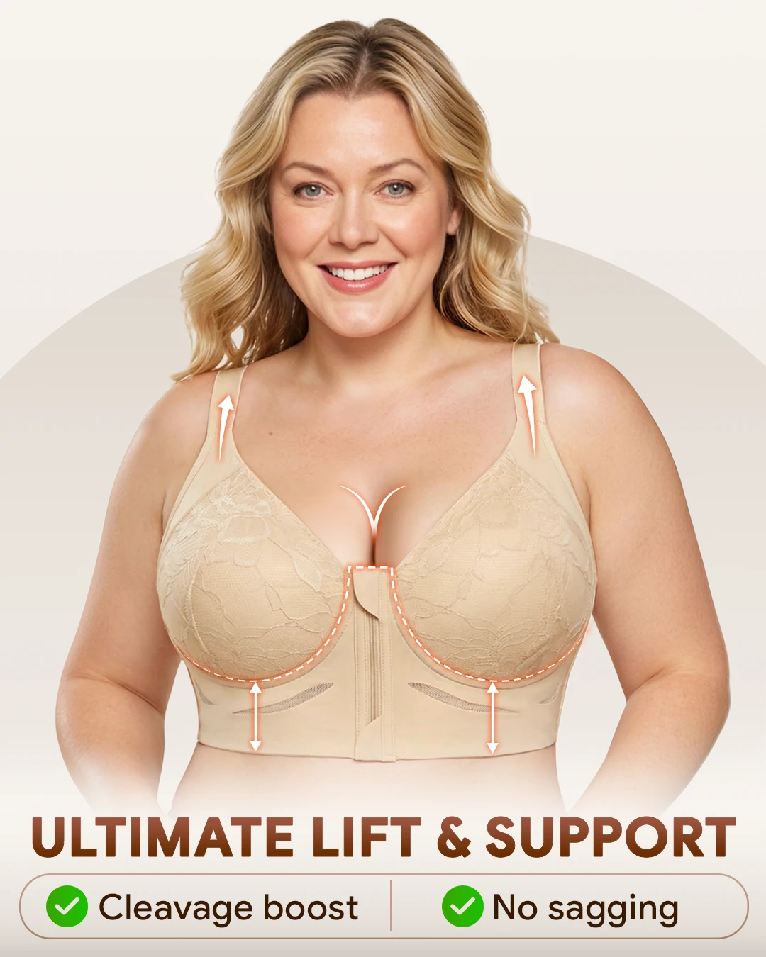 Well, this bra is seriously built to hoist and hold the girls up. I’m a 34E, and it fits really well. It stays put all day, no tugging it down or fiddling with the back. It smooths out my back and sides perfectly under a T-shirt, and the plunging neckline is spot-on for low-cut tops. I love that the straps are wider for extra comfort, especially for us bustier gals. The wide back band is exactly what I needed, regular bras always pull forward and create unflattering lumps. It’s true to size, super comfy without wires, and great for all-day wear. The only down point was that they were out of my favorite color when I ordered. Hope they'll restock soon